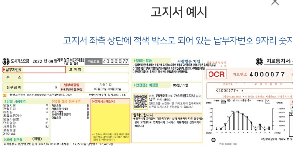 ▫ 도시가스사와 고객식별번호(납부자번호), 캐시백을 현금으로 지급받을 계좌정보를 입력합니다. 고객식별번호는 위 이미지 참고해 주세요.