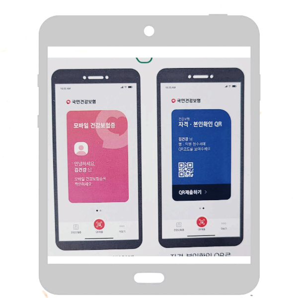 4. 병원에서 신분증제시를 요구할 경우 앱을 실행시켜 로그인 후 모바일 건강보험증이나 QR 코드를 생성하여 30초 내에 인식기기에 가까이 대고 읽히면 제출완료(QR코드 확인은 일부 병원에서만 가능할 수 있습니다.)