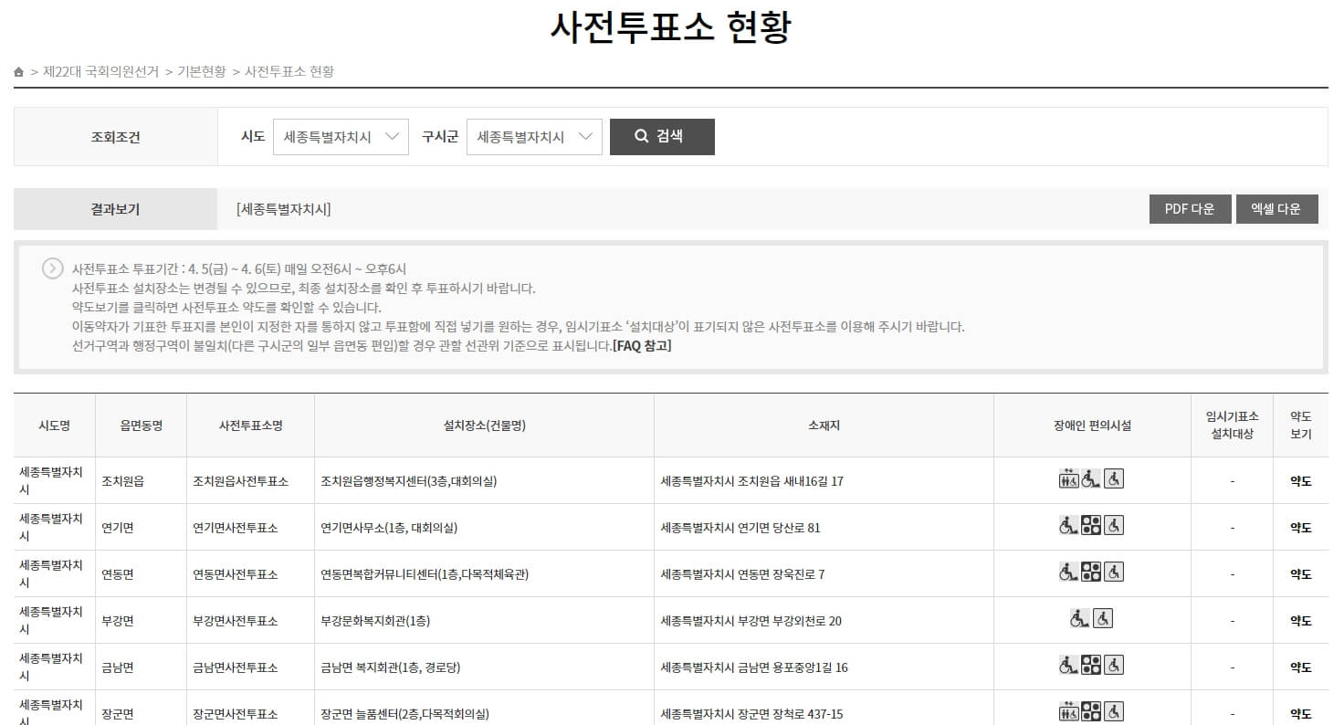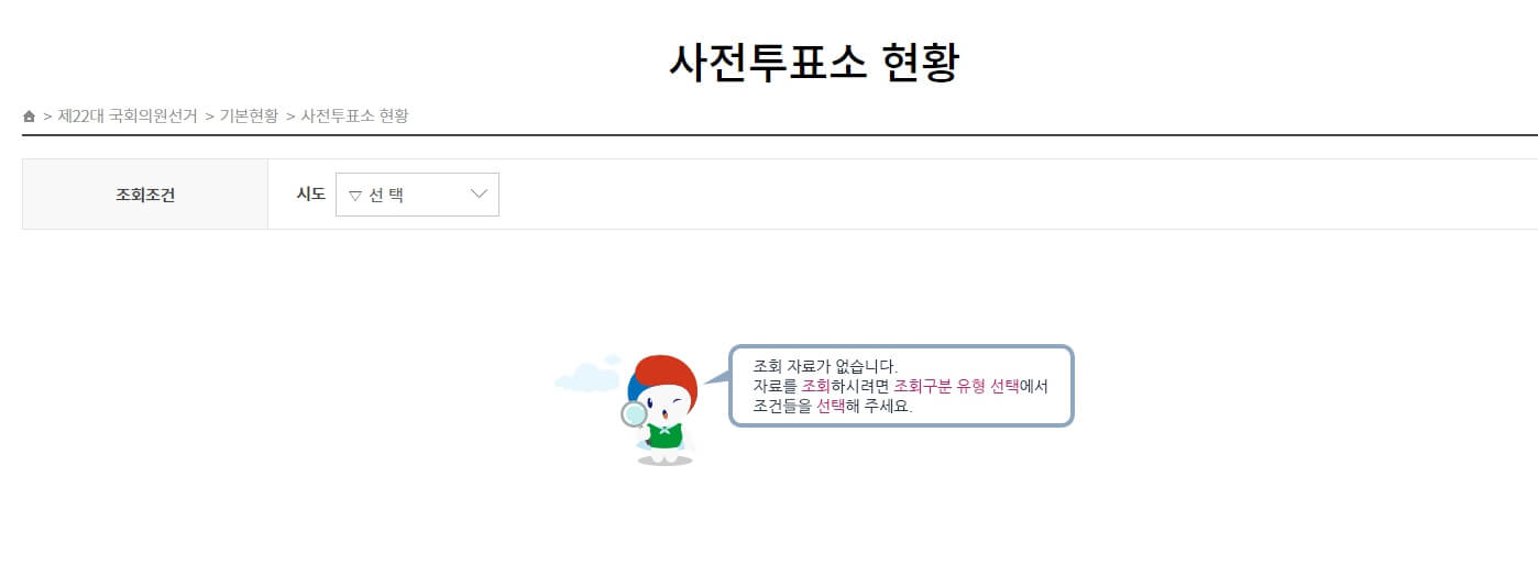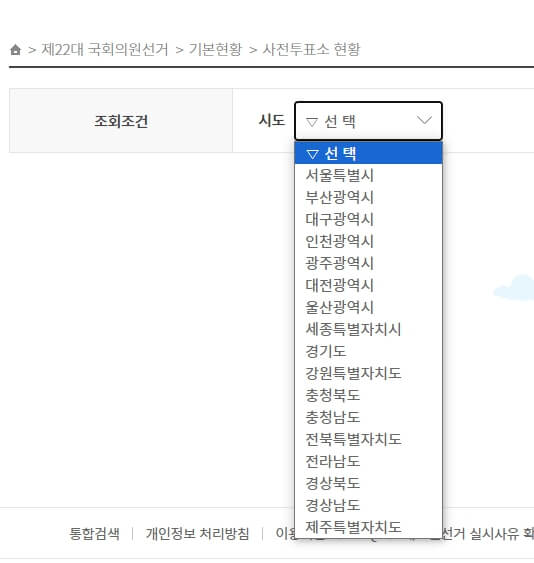 사전투표장소는 원하는 지역을 찾아서 쉽게 조회할 수 있습니다.