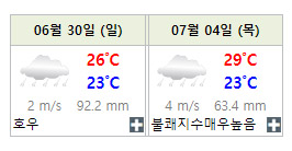 서울 장마기간중 7월 첫째 주까지의 예상강우량을 확인해 보니 6월 30일 92.2 mm, 7월 4일 63.4 mm로 집중적으로 많은 비가 내릴 것으로 예상되오니, 외출하실 때, 운전하실 때 각별히 주의하시길 바랍니다.
