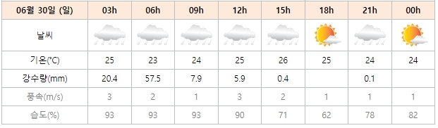 본격적인 서울 장마 시작을 알리는 6월 30일의 예상 강우량은 새벽 시간에 주로 많이 올 것 같네요. 새벽 3시부터 9시까지 어마어마한 비가 쏟아질 것으로 보입니다.