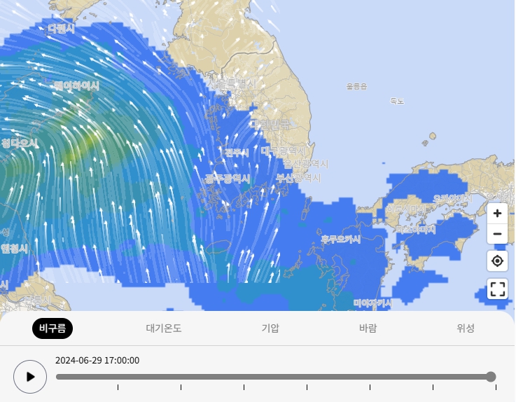 웨더뉴스의 비구름 예상경로 레이더에서 발췌한 6월 29일 오후 5시경의 비구름 예상 경로입니다. 제주도, 전라권은 이 날 오전부터 비가 올 것으로 예상되고, 점차 충청권, 경남권, 서울, 경기까지 확대될 것으로 보입니다.