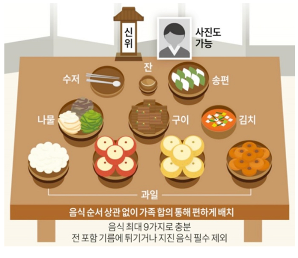 음식의 종류나 가짓수를 꼭 채워야 한다는 부담을 덜어 설에는 떡국, 추석에는 송편을 중심으로 하여 나물, 구이, 김치, 과일, 술을 포함하여 총 9가지의 음식을 올릴 수 있다고 합니다. 그동안 제사 음식 준비에 가장 큰 비중을 차지했던 전과 같은 기름에 튀기거나 지진 음식은 꼭 올리지 않아도 되고, 홍동백서, 조율이시 같은 예법은 예법을 다룬 문헌 자체에는 아예 없는 표현이기 때문에 배치 순서에 상관없이 편하게 놓아도 됩니다.