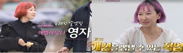 제작진과의 사전 인터뷰때부터 화려한 머리 색깔로 눈길을 끌었는데 머리 색깔을 원래 자주 바꾼다고 합니다. 소화하기 어려운 색인데도 잘 어울리는 것 같네요. 개성 있는 직업만큼이나 화려한 색의 헤어스타일만 보아도 매력이 넘치는 분인 건 분명한 것 같습니다.