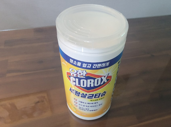 플라스틱 원통형에 담겨 있는 유한 세정살균티슈는 완전히 밀폐되는 뚜껑은 아니지만 잘 닫히고 편하게 열 수 있어요. 처음 사용시에는 본 뚜껑을 돌려서 열면 비닐 덮개가 있는데 이것을 먼저 제거 하고 뚜껑에 티슈를 끼워서 사용하면 한장씩 잘 끊여져서 사용하기 편해요~ 향은 시트러스 향이긴 한데 그리 세진 않은 것 같지만, 아무래도 락스제품이다 보니 락스향이 나기는 하는데 이 또한 저는 그리 강하게 느껴지진 않았습니다. 락스 냄새에 예민하신 분들은 싫어하실 수도 있을 것 같아요. 티슈를 한 장씩 끊어서 원하는 곳에 쓱쓱 닦아서 사용해요. 일반 적인 오염은 큰 힘을 들이지 않아도 잘 닦여지고, 오염이 심한 부분은 힘을 조금 들여서 닦으면 잘 닦입니다.