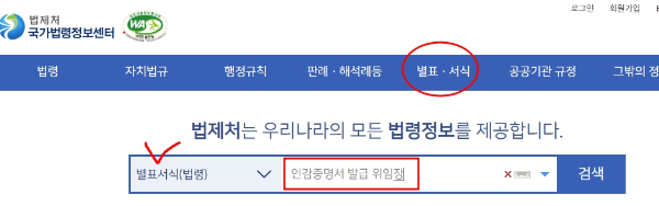 ◼ 국가법령정보센터 홈페이지에서 윗 줄에 있는 별표·서식을 클릭하거나 메인페이지의 검색창에 있는 검색방식설정을 별표서식(법령)으로 설정한 후 "인감증명서 발급 위임장"을 검색하면 파일을 다운받아 인쇄할 수 있습니다.