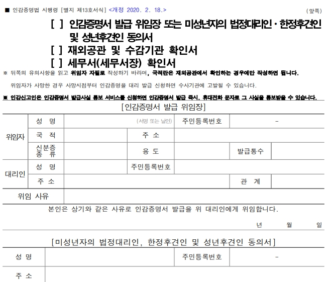 ◼ 대리발급시 위임장은 위임자 본인이 자필로 작성해야 하며 대리인이 작성해서는 안됩니다. 또한 대리인이 위임자의 동의 없이 허위로 위임장을 작성할 시 사문서 위조로 형사고발 대상이 될 수 있으니 반드시 위임자의 동의와 함께 자필로 작성한 위임장이 필요합니다.
