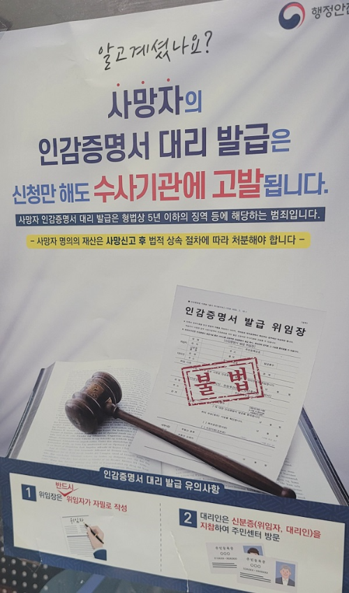 ◼ 결론부터 말씀드리자면 절대 안됩니다. 사망자의 인감증명서 대리 발급은 불법으로 신청만 해도 수사기관에 고발되며, 형법상 5년 이하의 징역 등에 해당하는 범죄입니다.