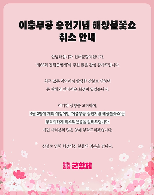 - 3월 29일부터 4월 6일까지 진행되는 진해 군항제는 4월 2일 예정이었던 '이충무공 승전기념 해상불꽃쇼'와, 3월 29일 개최예정이었던 해군군악연주회, 3월 29일 통영, 3월 30일 웅동2동에서 개최예정이었던 해군 홍보대 프린지 공연등을 취소하며 예정보다 대폭 축소되어 진행됩니다.
