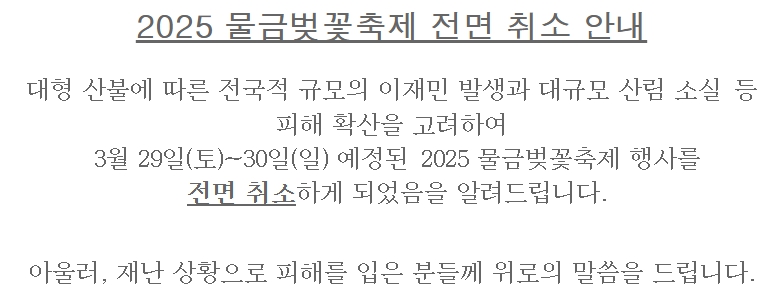 - 3월 29일부터 30일까지 예정되어 있었던 2025 양산 물금 벚꽃축제 행사는 대형 산불로 인한 이재민 발생과 산림 소실등의 피해 확산을 고려하여 전면 취소하게 되었습니다.