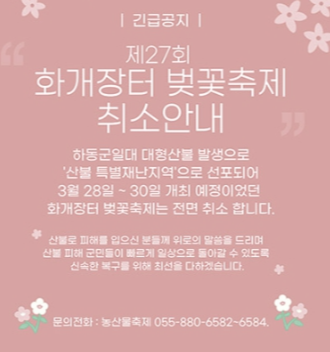 - 3월 28일부터 30일까지 개최 예정이었던 하동 화개장터 벚꽃축제는 하동군 일대에서 발생된 산불로 '산불 특별재난지역'으로 선포되어 전면 취소되었습니다.