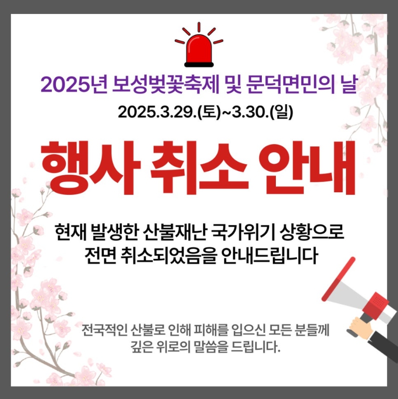 - 3월 29일부터 30일까지 진행예정이었던 보성벚꽃축제 및 문덕면민의 날 행사는 산불재난 국가위기 상황으로 인해 전면취소되었습니다.