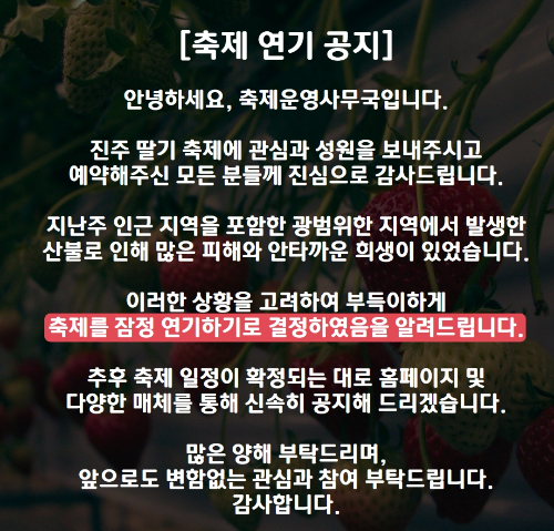 - 진주 딸기 축제 잠정 연기, 유료 프로그램 예매는 환불 진행