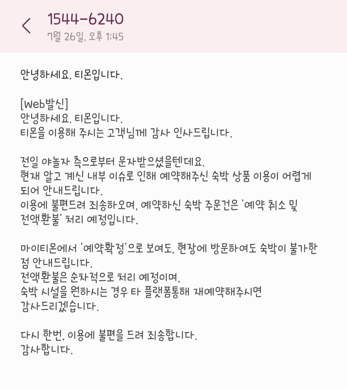 이 문자는 야놀자를 통해 여행숙박을 예약한 사람들에게만 보내진 것 같아요. 예약한 숙박 주문건은 예약 취소 및 전액 환불 처리가 될 예정이라는 것이죠. 과연 정말 그렇게 될까요?