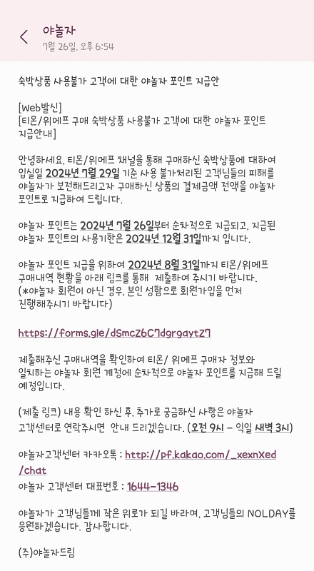 티몬이나 위메프를 통해 예약하신 숙박상품에 대해 이번 티몬 부도, 위메프 부도 사태로 인해 사용불가 처리가 되지만, 링크를 통해 구매현황 내역을 제출하면 결제 금액 전액을 야놀자 포인트로 지급해주겠다는 내용이었습니다.