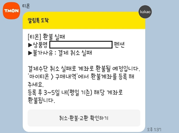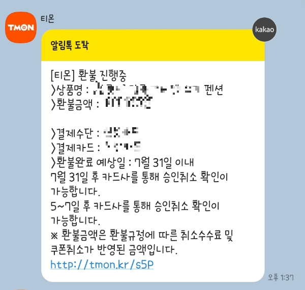 📢 예약했던 숙소의 환불 규정 상 아직 3주정도 남았기 때문에 100% 환불이 가능했고, 티몬 앱에서 환불 신청을 했습니다. 곧바로 카톡을 통해 알림톡이 도착했는데요. 환불 진행중이라는 메세지와 함께 또다른 메세지가 거의 동시에 도착했습니다. ↓ ↓ ↓
