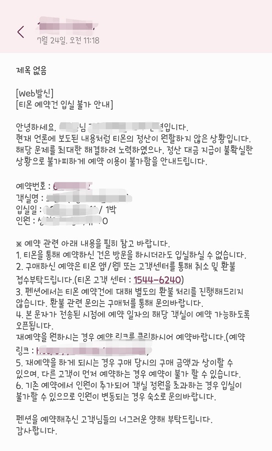 📢 그런데 오늘 (7월 24일) 오전에 펜션 측으로부터 티몬 정산 미지급 이슈로 인한 티몬 예약건 입실 불가라는 문자를 받게 되었어요. 이게 정말 웬 난리인가요?