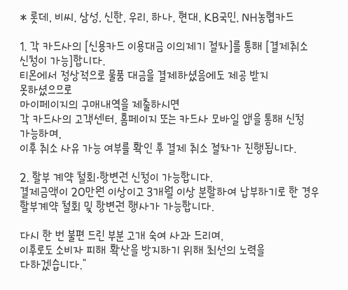 티몬 환불때문에 신한카드에 결제 취소 요청 신청은 해놓았지만, 이 또한 뭔가 후련하지는 않네요. 확실하게 취소 결과가 나와야 안심이 될 것 같습니다. 그래도 티몬에서 카드로 결제하고 취소가 되지 않는 분들은 사용하신 카드사에 직접 문의해보시면 좋을 것 같습니다.