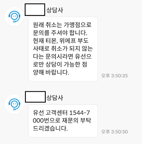 "원래 취소는 티몬으로 문의를 해야 하나, 현재 티몬 부도, 위메프 부도 사태로 취소가 되지 않는다는 문의라면 유선으로만 상담이 가능합니다."