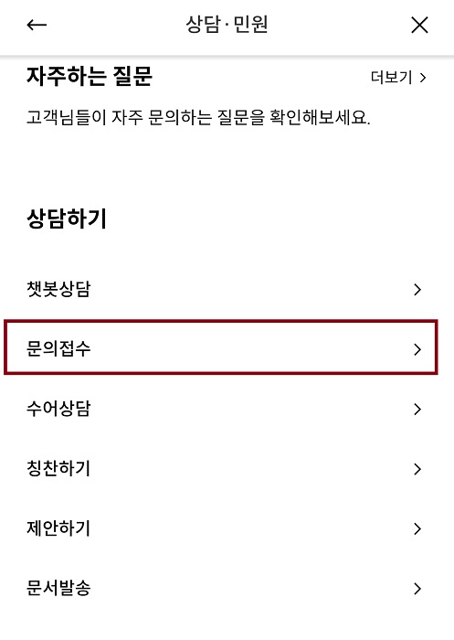 로그인 후 고객센터 메인 → 상담·민원 → 문의접수 → 문의하기