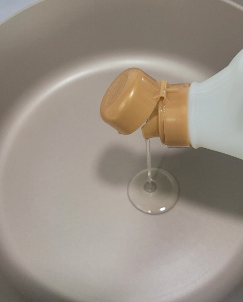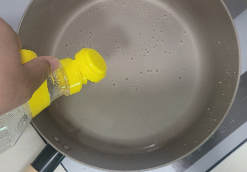- 건조된 후라이팬에 기름을 한 스푼 정도 떨어뜨리고, 약한 불에서 후라이팬을 살짝 움직여서 골고루 스며들도록 합니다.