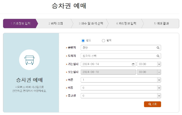 1. 2024 추석 고속버스 예매를 위해 코버스에 로그인하여 출발지와 도착지, 가는 날까지 선택 후 조회하기