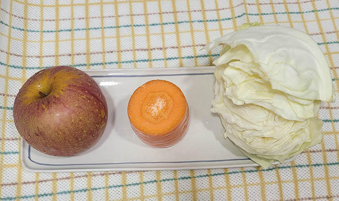 저는 냉장고에 사과가 하나뿐이라서 사과의 무게를 기준으로 하여 양배추와 당근의 양을 정하였습니다.