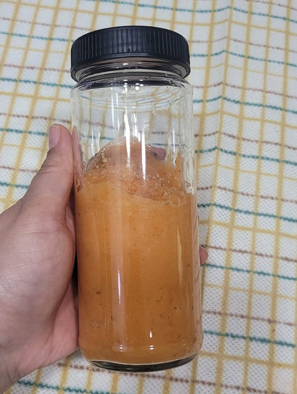완성된 CCA 주스는 주스라고 하기보다는 약간은 스무디에 가까운 질감이었어요. 아무래도 물을 더 넣었어야 했나 싶지만 나름 씹히는 맛도 있어서 포만감을 느끼기에는 더 좋았어요. 당근 덕분에 색도 너무 예쁘고 양배추와 사과의 향이 구미를 당겨서 더욱 맛있게 먹을 수 있었습니다.