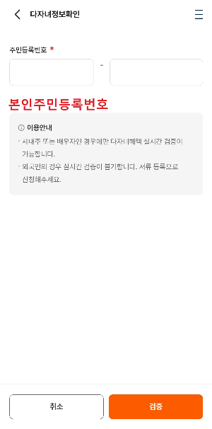 ◼ 다자녀 정보확인 페이지에서 K패스 카드를 소유한 부모(본인)의 주민등록번호를 적고 검증버튼을 누릅니다.