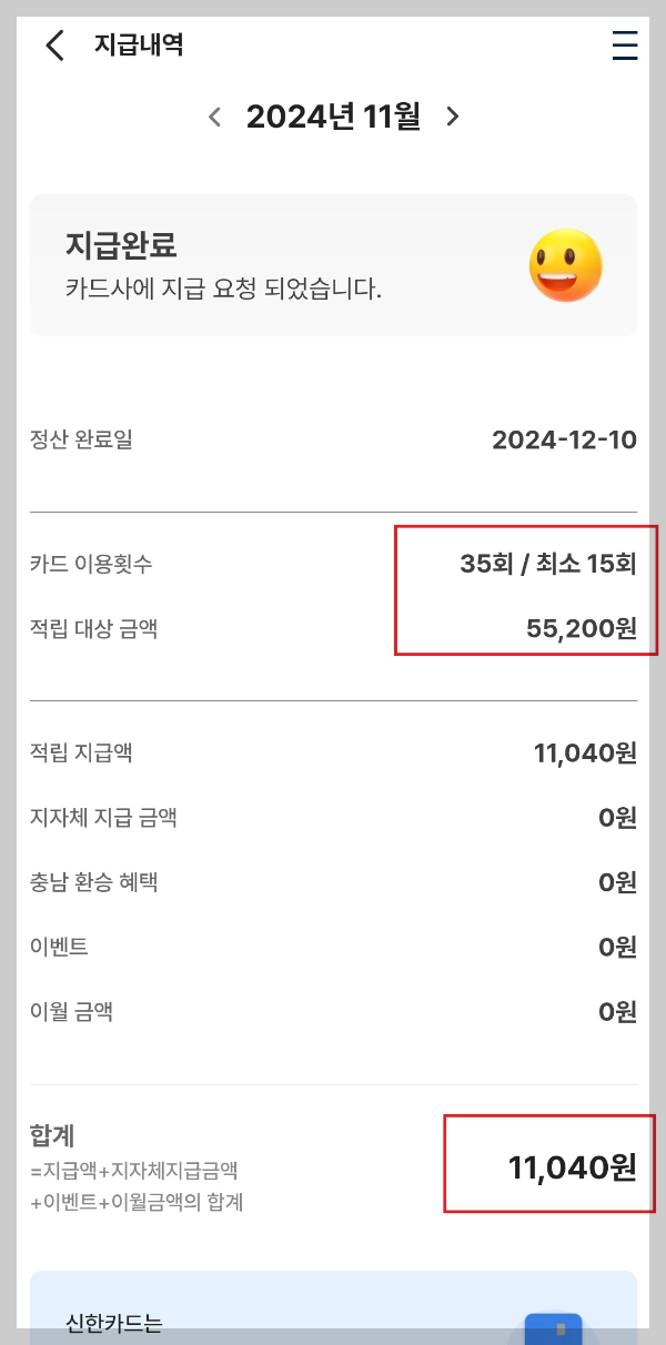 ◼ 11월에 저는 대중교통을 지급기준인 최소 15회를 넘어 최종적으로 35회 이용을 하였고, 적립지급액은 적립대상금액의 20%(일반인기준)인 11,040원을 환급받았습니다. 이 정도면 K패스카드를 이용하지 않을 수 없겠죠? 아직 이용하지 않으시는 분들은 하루라도 빨리 K패스 카드를 발급받아 혜택받으시길 바랍니다.