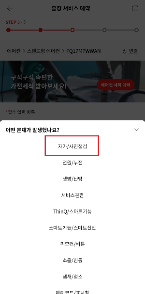 ◼ 로그인 후 제품 모델명과 제조번호 입력 후 증상 선택에서 자가/사전점검 → 사전점검 선택하기