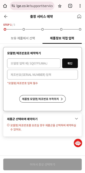 ◼ 로그인 후 제품 모델명과 제조번호 입력 후 증상 선택에서 자가/사전점검 → 사전점검 선택하기